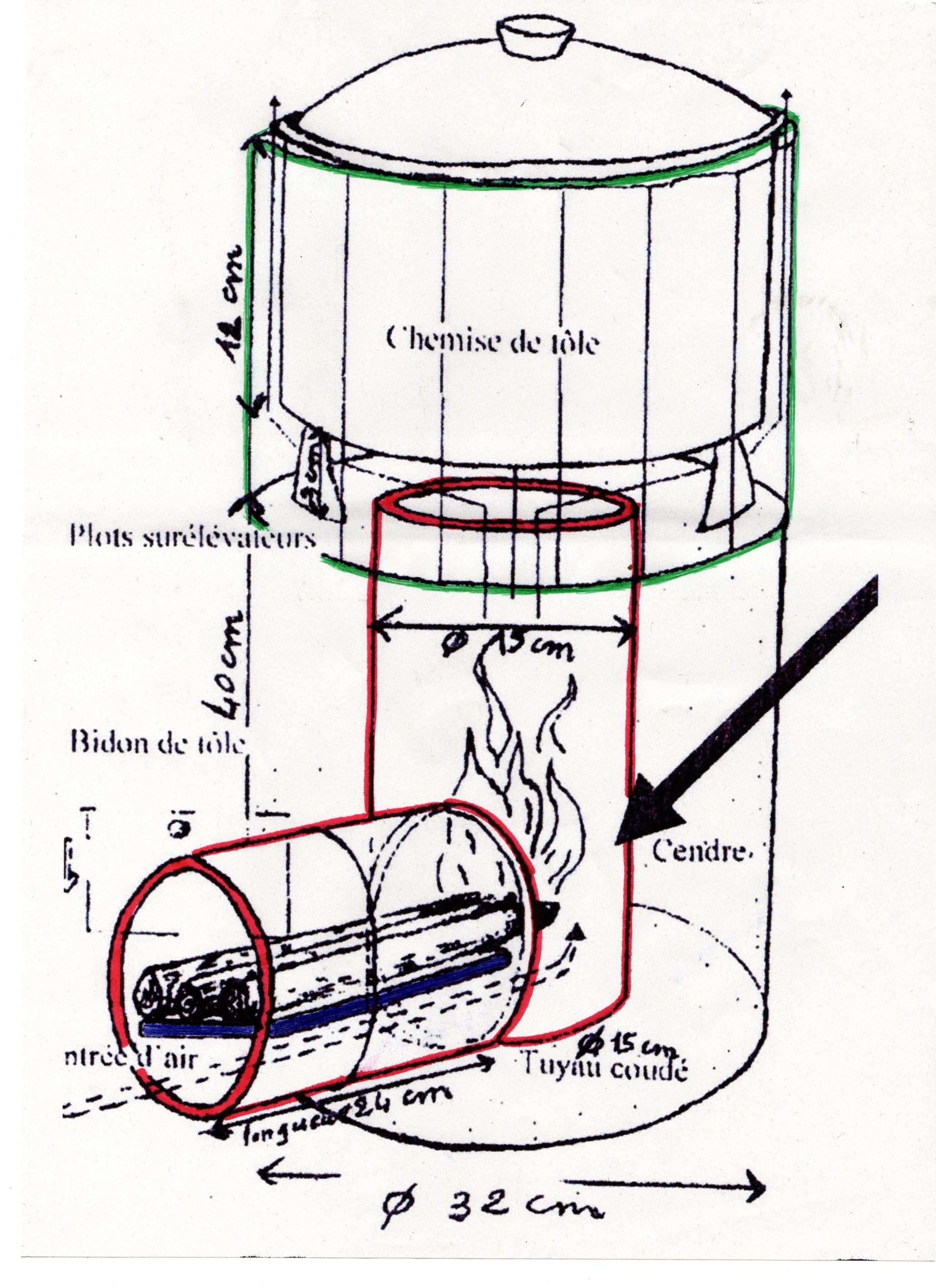 | Le but du CEB est d’utiliser le moins de bois possible et de l’utiliser au mieux possible ( combustion du bois maximale ). Pour ce faire, la première innovation dans cet outil est d’avoir isolé le « foyer  » ( tube coudé se passe la combustion) de l’extérieur grâce à un matériau ayant de bons pouvoirs isolant ( la cendre est très utilisée car très facile à trouver et performante ) et ainsi éviter les pertes de chaleur par conduction avec l’extérieur et optimiser le rendement calorifique pour la cuisson. |
