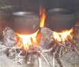 | Nous avons réalisé une expérience de cuisson en temps réel à l’école pour permettre une comparaison de performance entre le foyer traditionnel et le CEB. Pour cela nous avons placé dans 2 marmites la même quantité de boulgoure qui servira à nourrir les 172 élèves de l’école ( donc, 86 par marmite ). Puis nous avons préparé 2 tas de bois identique pour chacun des foyers. Nous avons allumé les 2 foyers au même moment puis nous avons relevé régulièrement les informations ( ébullition de l’eau, quantité de bois, changement, ... ) |